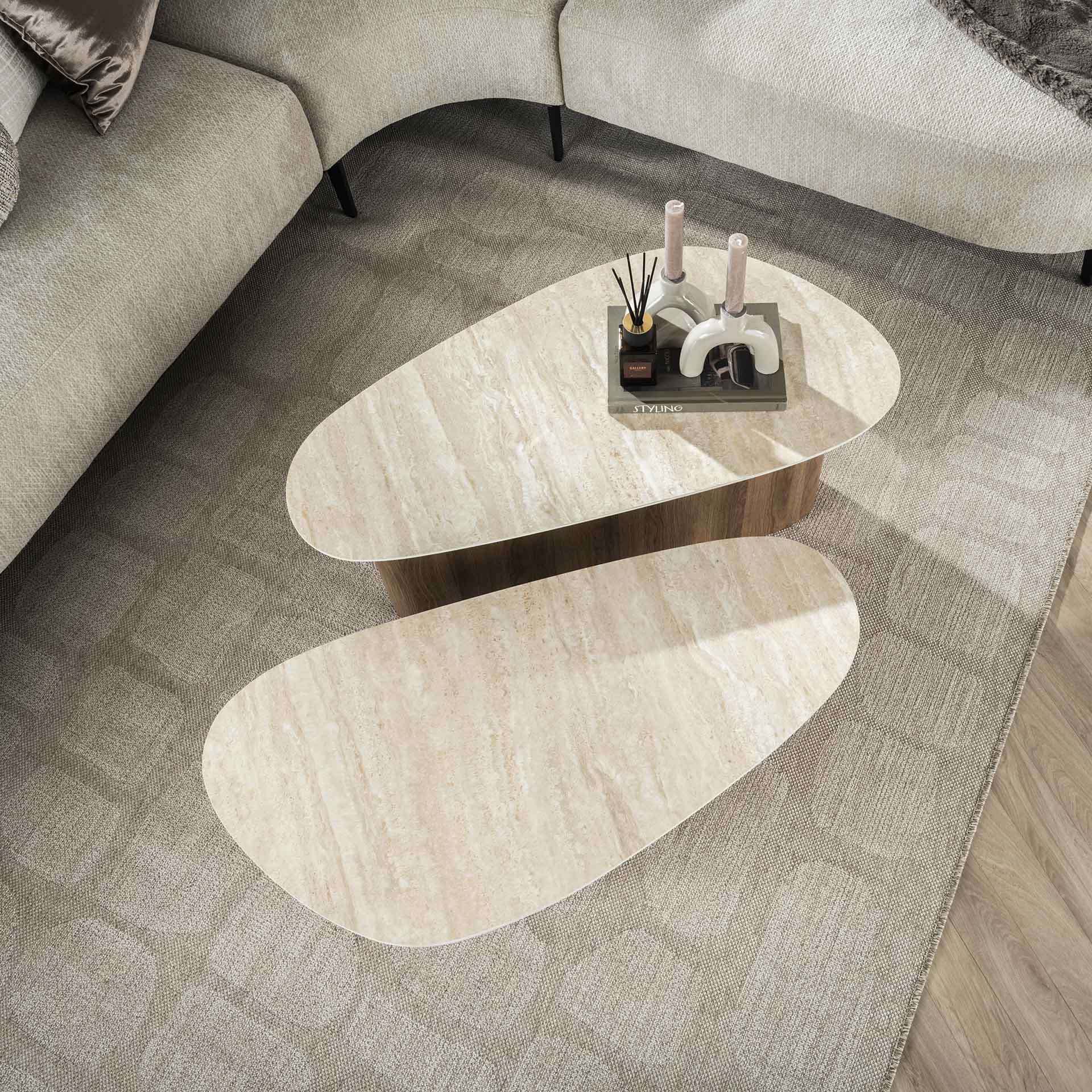 Dieses elegante, dreieckige Couchtisch-Set (2 Stück) kombiniert ein stabiles Holzgestell mit einer luxuriösen Keramikplatte in Travertin-Optik, was ihm einen raffinierten Look verleiht. Perfekt für moderne und klassische Interieurs. Diese Tische sind vielseitig und funktional.