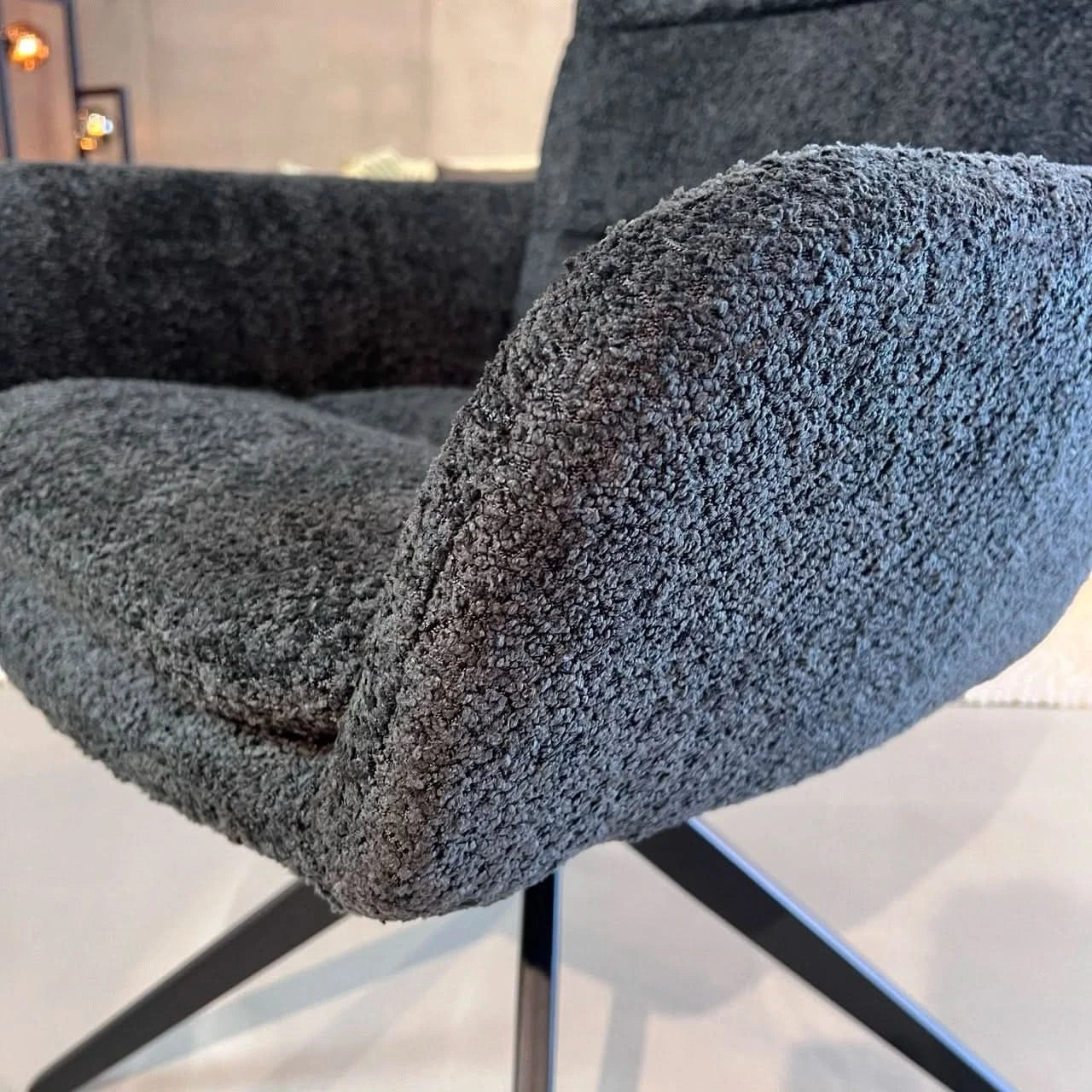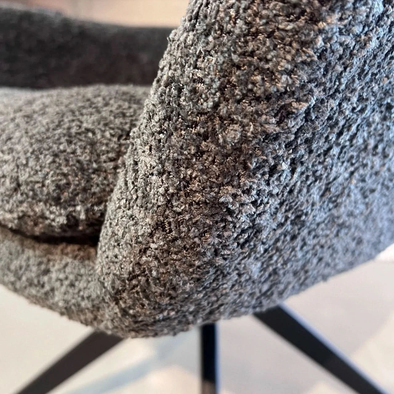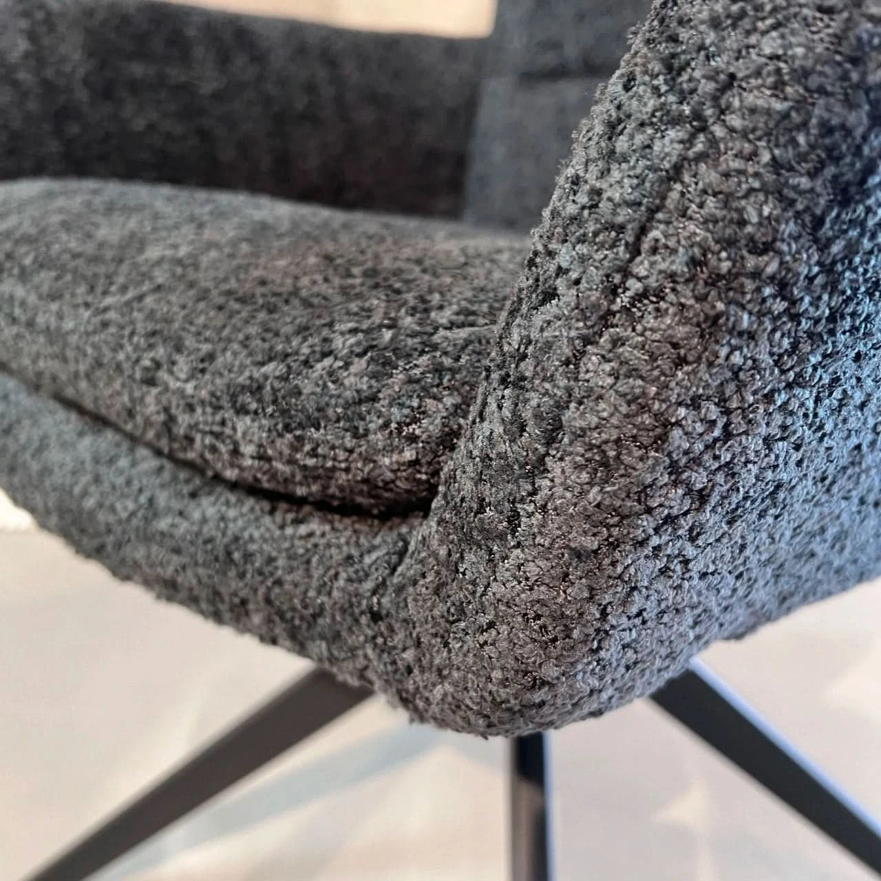 • Stoff Bouclé: Der hochwertige Bouclé-Stoff sorgt für eine besondere Haptik und verleiht dem Stuhl eine edle, texturierte Oberfläche, die sich angenehm anfühlt und zugleich robust ist.