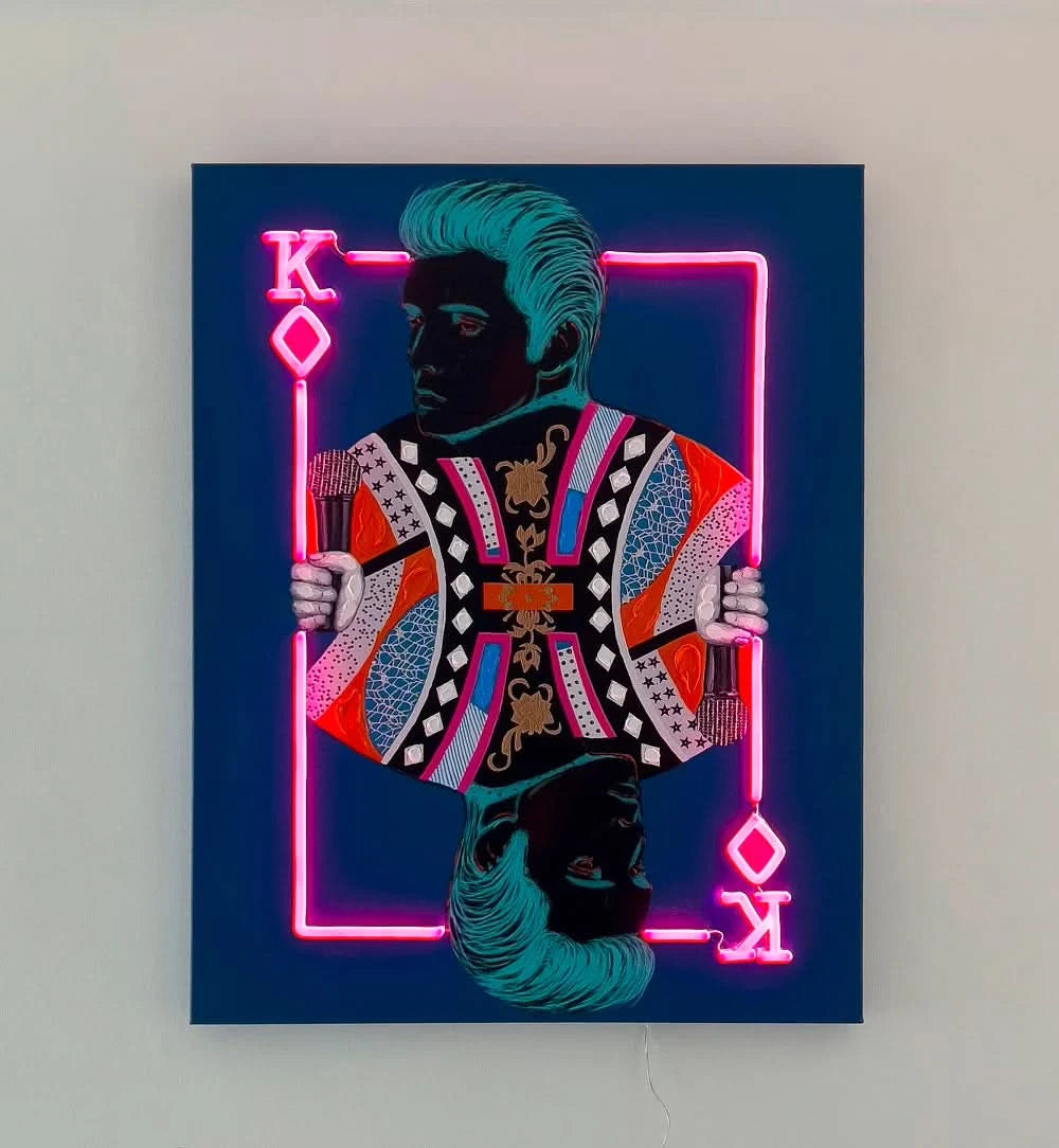 Der einmalige King of Pop ist da. Unser auffälliges und individuelles Neon-Kunstwerk auf Leinwand ist eine coole und lebendige Ergänzung für jeden Raum. Das „Elvis“-Wandbild wird auf Leinwand gedruckt und von Hand mit einem Hauch von Acrylfarbe veredelt, was dem Design Textur und Mischtechnik verleiht. Pinkes LED-Neon wird dann auf die bedruckte Leinwand gelegt, um ihr den perfekten Neon-Knall zu verleihen und den WOW-Faktor in Ihr Interieur zu bringen.