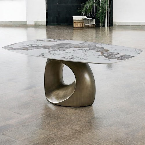 aus Fiberglas und Brushed Bronze ist ein Tisch mit einer Länge von bis zu 240 cm, der durch sein außergewöhnliches Design auffällt. Sein zentraler Fuß verleiht ihm einen eleganten Charakter. Die massive Konstruktion sorgt für hohe Stabilität, während die großzügige Tischplatte viel Platz für gesellige Runden bietet.