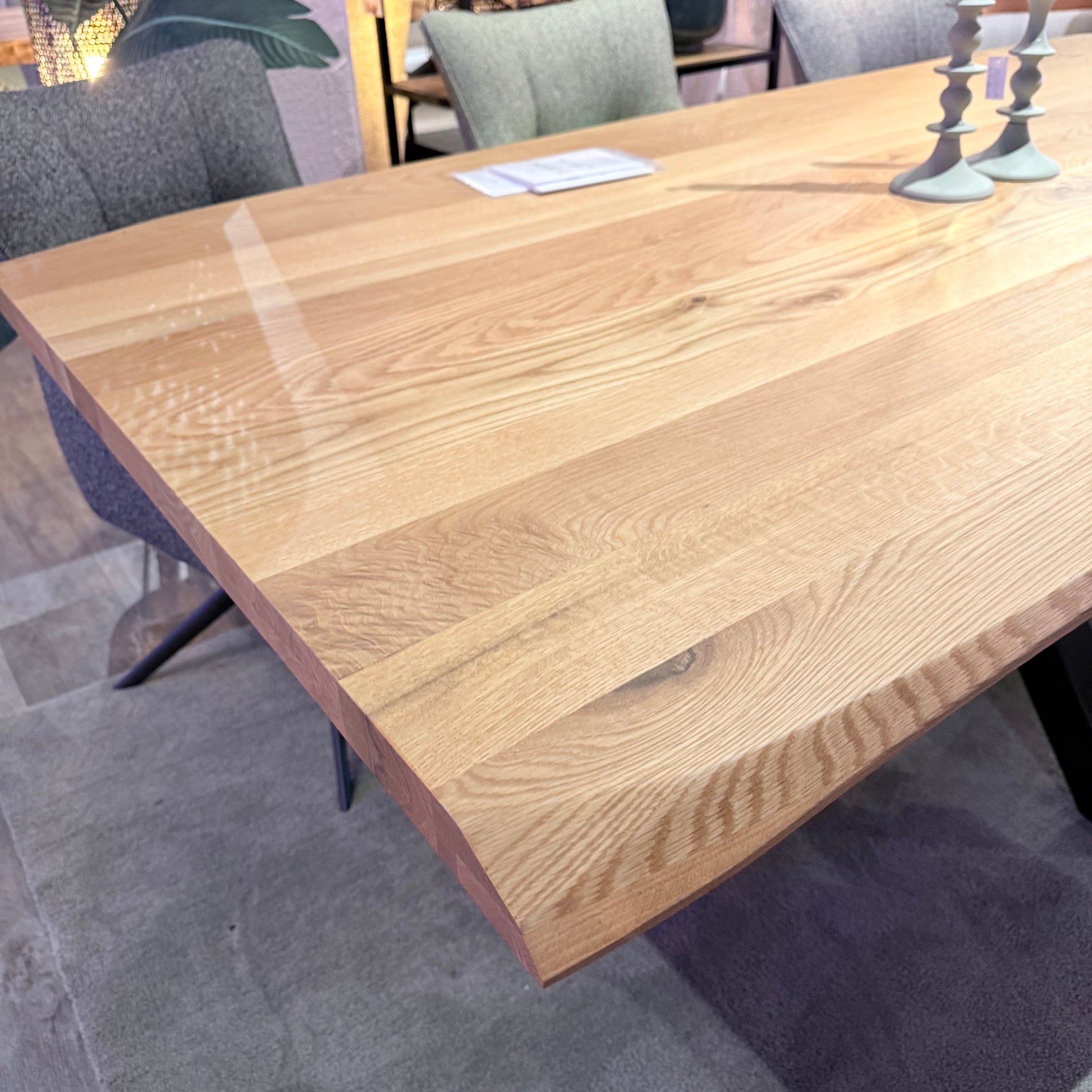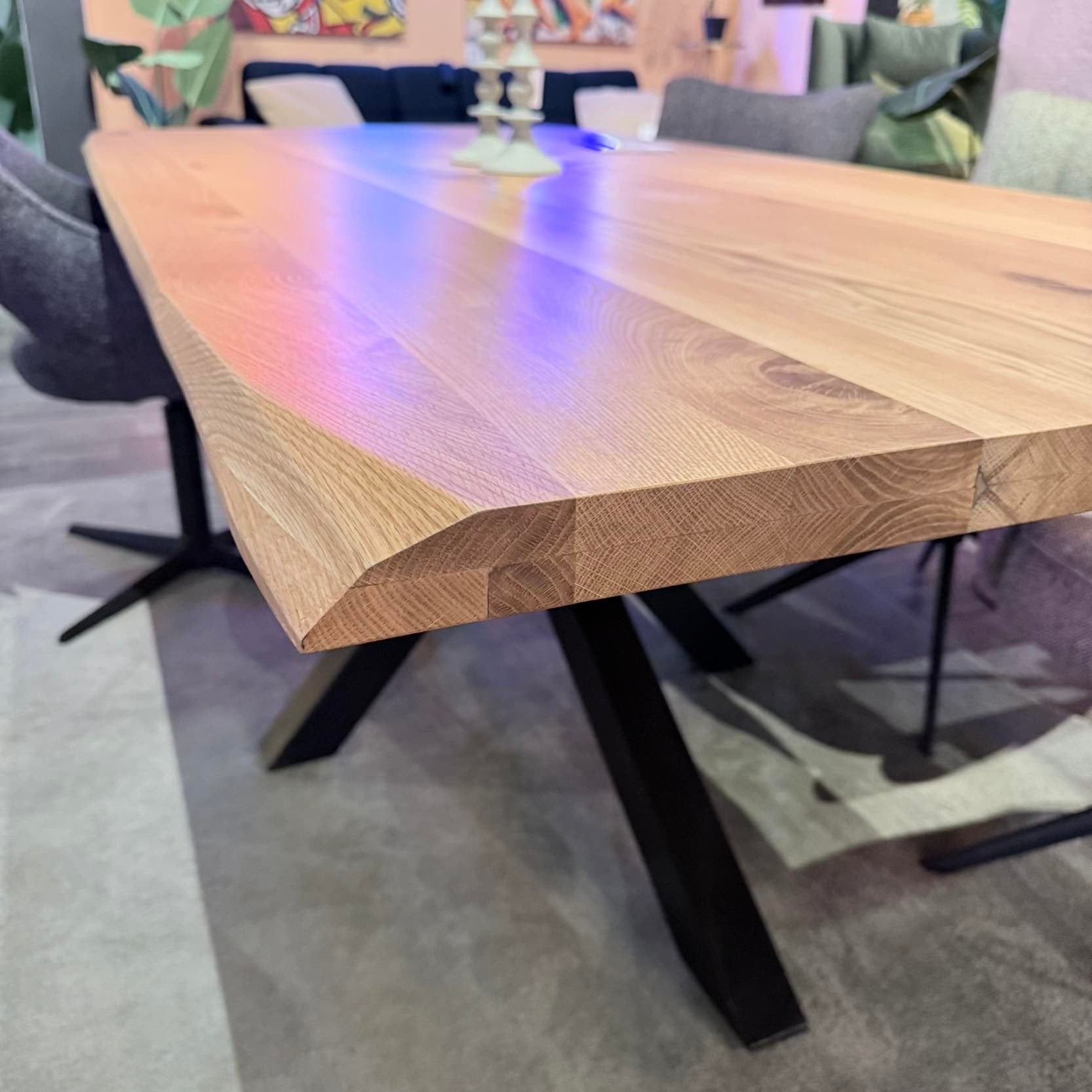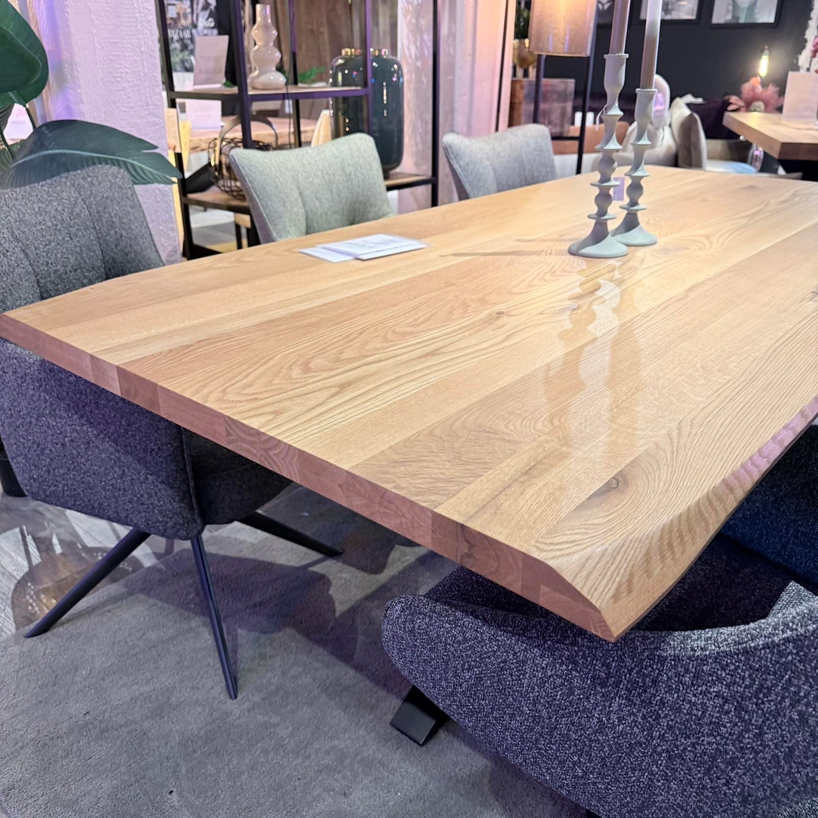 Die charakteristische Wechselkante unterstreicht den natürlichen Charakter der Eiche und macht jede Tischplatte zu einem individuellen Möbelstück mit einzigartiger Maserung.
