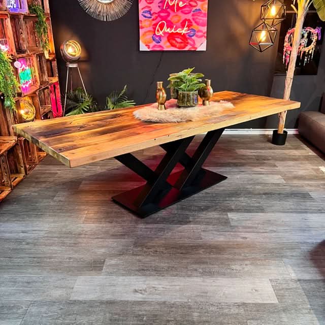 Dieser Esstisch aus 5cm dickem Eichen-Altholz ist ein absolutes Unikat. Das Holz stammt aus alten Häusern und Scheunen, wodurch jeder Tisch eine Geschichte erzählt. Die gerade Kante und der BigFoot Double Fuß machen ihn nicht nur stabil, sondern auch zum Hingucker in jedem Raum.
