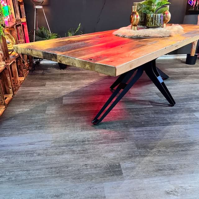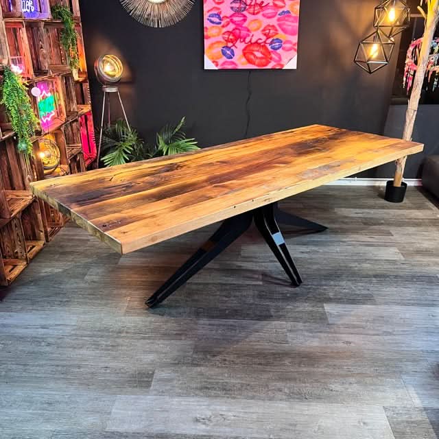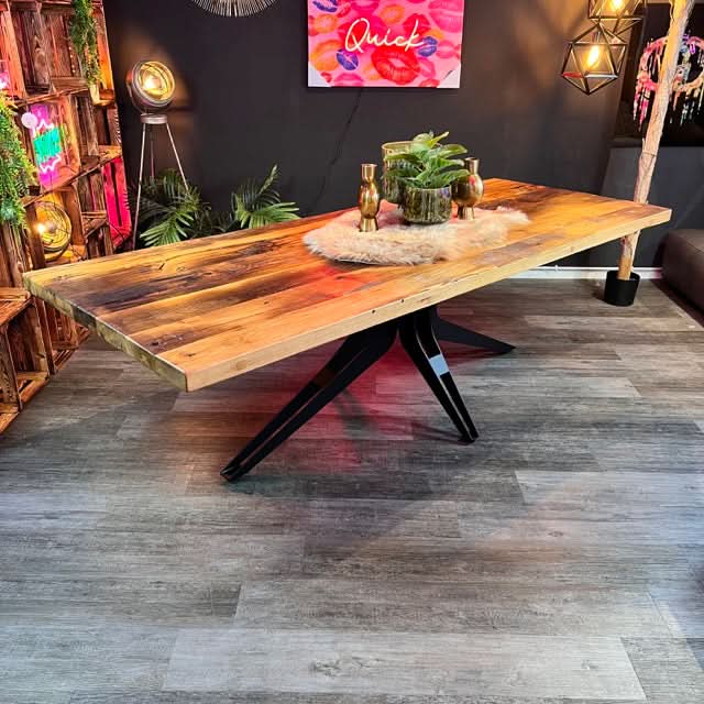 Dieser Esstisch aus 5cm dickem Eichen-Altholz ist ein absolutes Unikat. Das Holz stammt aus alten Häusern und Scheunen, wodurch jeder Tisch eine Geschichte erzählt. Die gerade Kante und der BigFoot Double Fuß machen ihn nicht nur stabil, sondern auch zum Hingucker in jedem Raum.