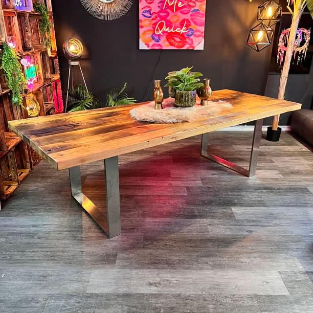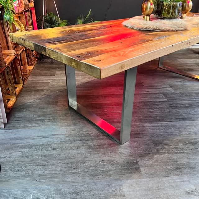 Dieser Esstisch aus 5cm dickem Eichen-Altholz ist ein absolutes Unikat. Das Holz stammt aus alten Häusern und Scheunen, wodurch jeder Tisch eine Geschichte erzählt. Die gerade Kante und der BigFoot Double Fuß machen ihn nicht nur stabil, sondern auch zum Hingucker in jedem Raum.