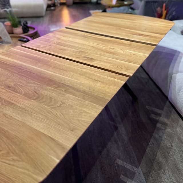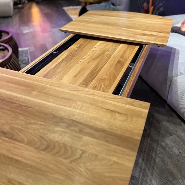 - Die Tischplatte ist aus massivem Eichenholz gefertigt und mit einem Lack bzw. Öl versiegelt.