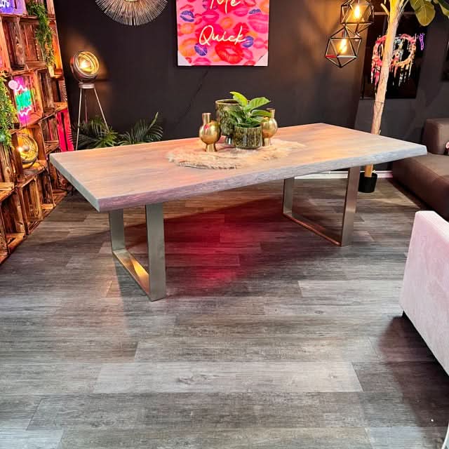 Unser trendiger Esstisch überzeugt durch eine perfekt gelungene Kombination aus Natürlichkeit und stylischer Moderne. Besonderes Highlight des Esszimmertisches sind die Tischkanten, die den natürlichen Formen eines Baumes entsprechen und direkt aus dem Baumstamm geschnitten wurden.