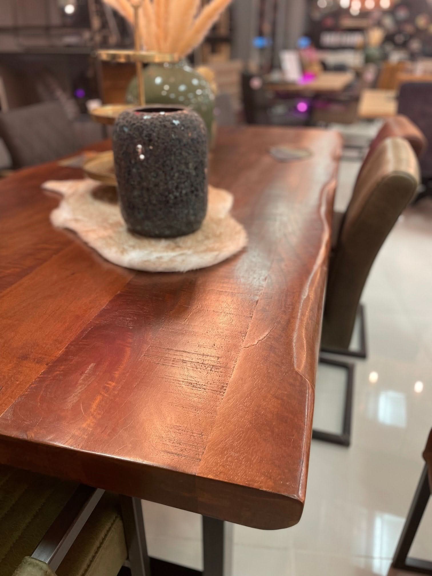 Der Esstisch Marie ist aus Mangoholz von allerbester Qualität gefertigt. Der robuste Tisch hat schöne natürliche Merkmale und Formen im Holz. Diese Eigenschaften verleihen diesem Baumstammtisch seinen Charme. Durch die Kombination mit einem schwarzen Metallbein passt dieser Tisch auch perfekt in ein industrielles Interieur. Der Tisch hat eine massive Platte von 3 cm, die an den Kanten auf 6 cm verdickt ist.