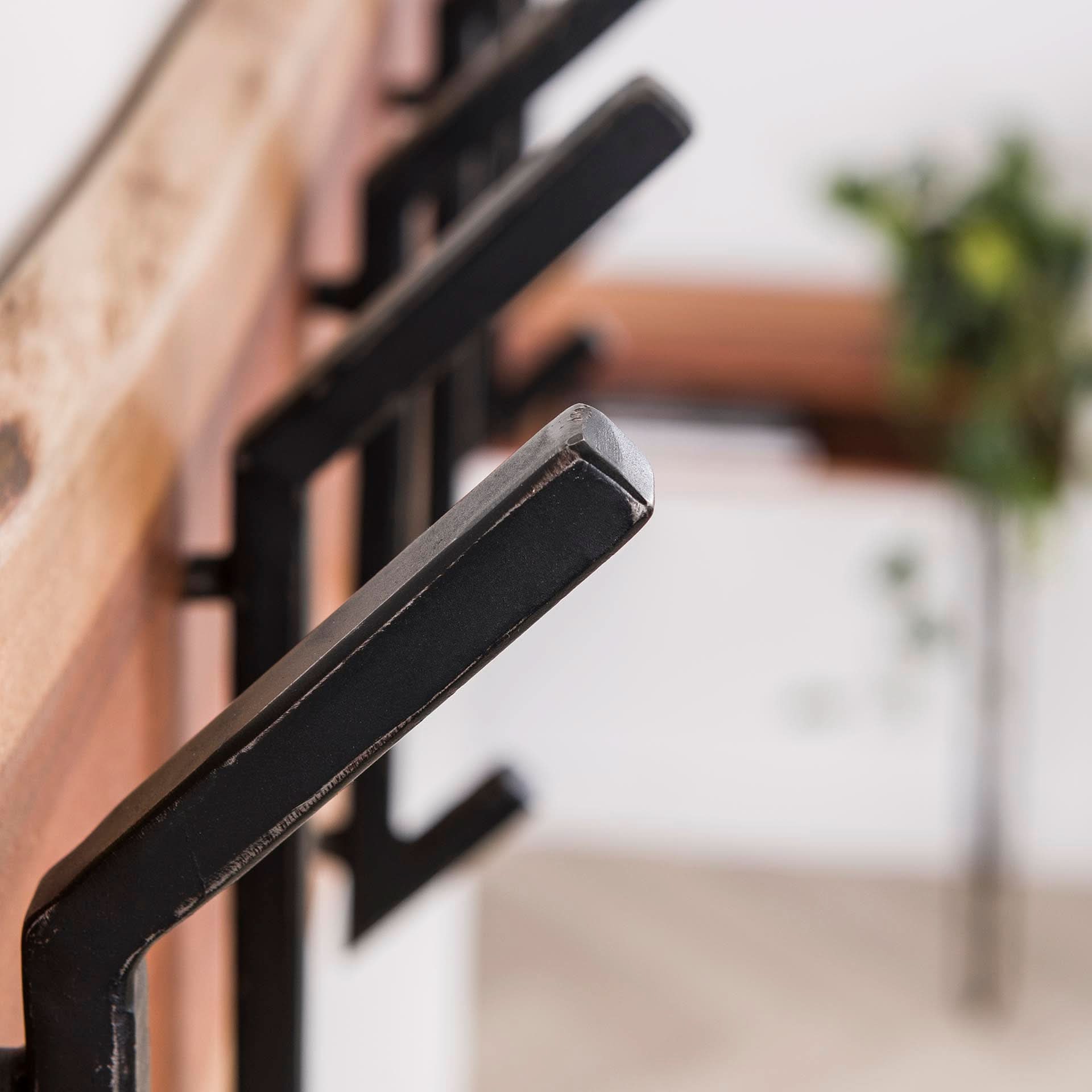 Dieser Garderobenständer besteht aus massivem Akazienholz mit einer Dicke von 25 mm. Sorgfältig ausgewähltes Holz mit feiner Maserung und verschiedenen Ästen, das nach traditionellen Methoden verarbeitet wird. Dadurch entsteht ein natürlicher und einzigartiger Look an der Wand. Dieses Modell verfügt über 6 Haken mit zwei Aufhängeoptionen, so dass 12 Mäntel aufgehängt werden können. Die Haken bestehen aus schwarz geschliffenem Metall. Die Garderobe ist auf der Rückseite mit zwei Befestigungsösen versehen, sodass die Garderobe problemlos an der Wand montiert werden kann.