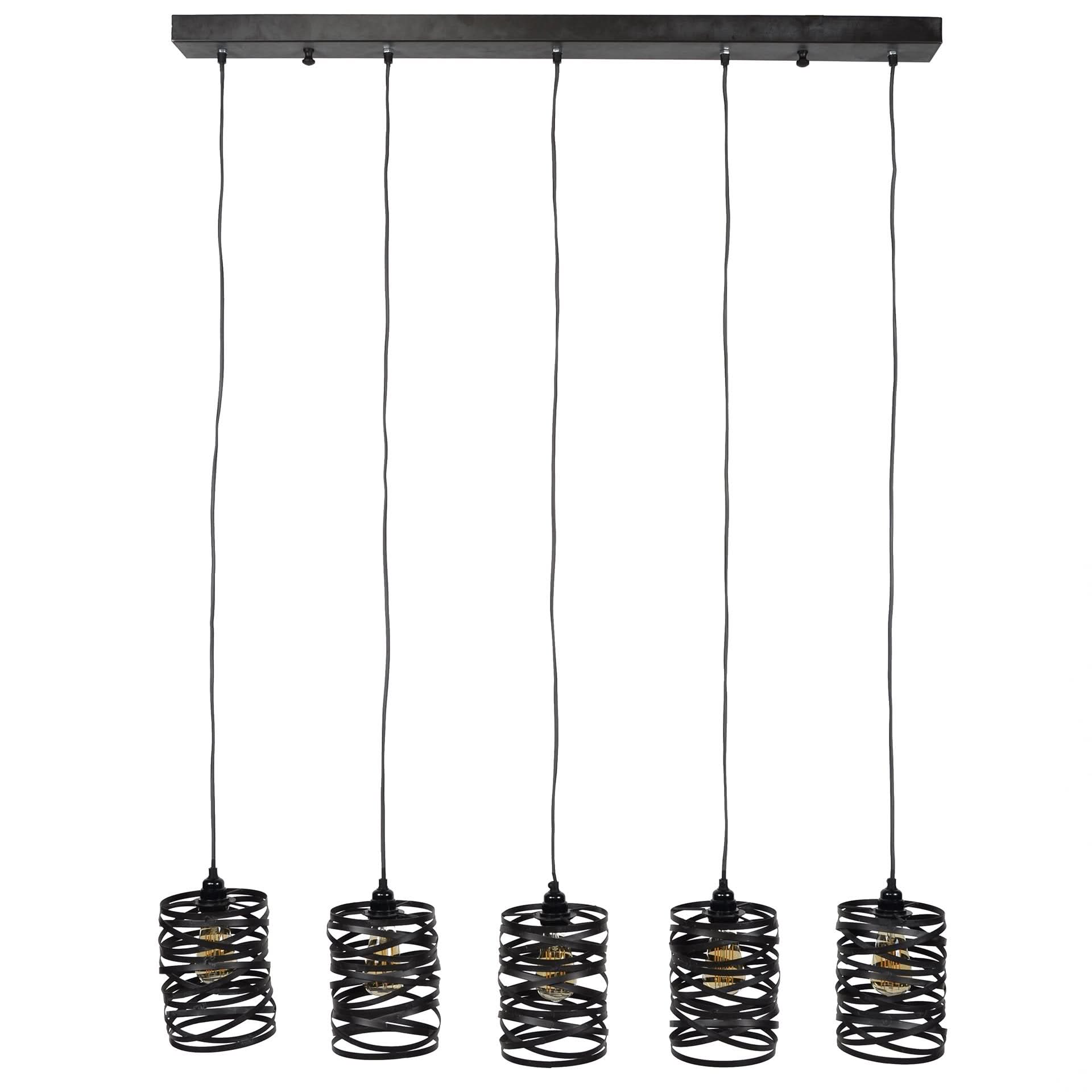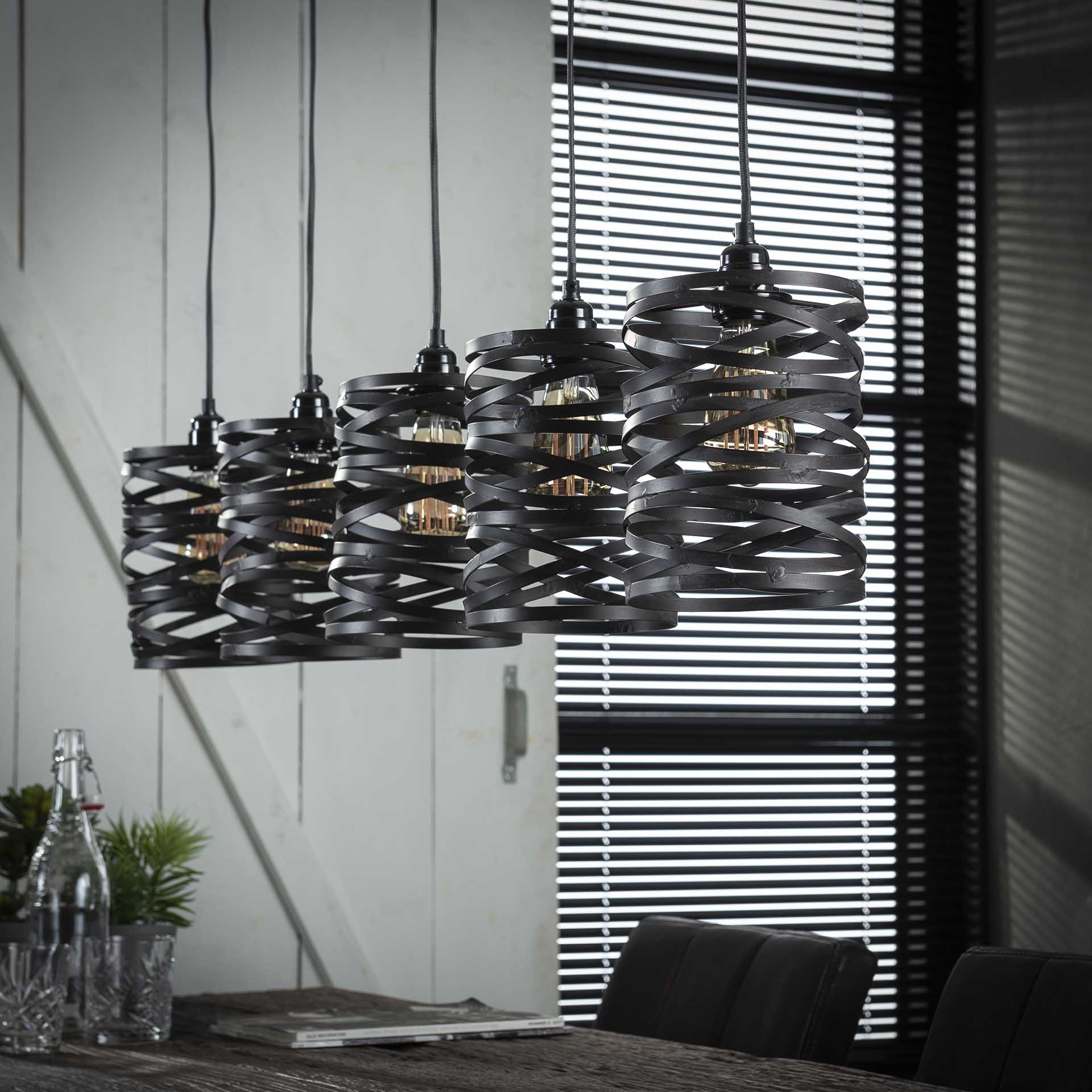Diese Hängelampe hat fünf Spindelschirme, die für eine sehr stilvolle zeitgenössische Lampe sorgen. Diese Metalllampe ist in Schiefergrau mit einem Hauch von Braun gehalten. Durch die Offenheit der Schatten wird das Licht angenehm im Raum verteilt. Jede Kapuze ist individuell höhenverstellbar bis zu 150 cm. Es wird empfohlen, eine LED-Lichtquelle (8450) zu verwenden. Diese Hängelampe ist Teil einer Serie bestehend aus einer Tischlampe, einer Stehleuchte und einer Hängelampe.
