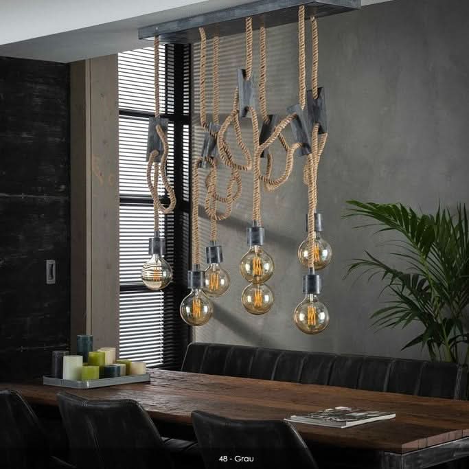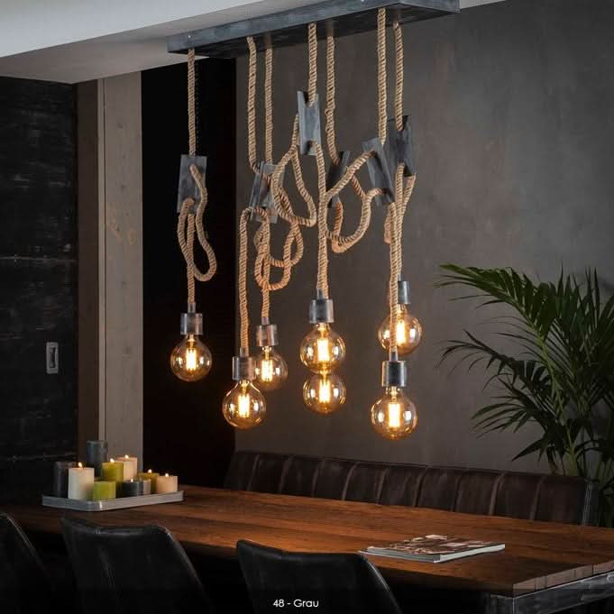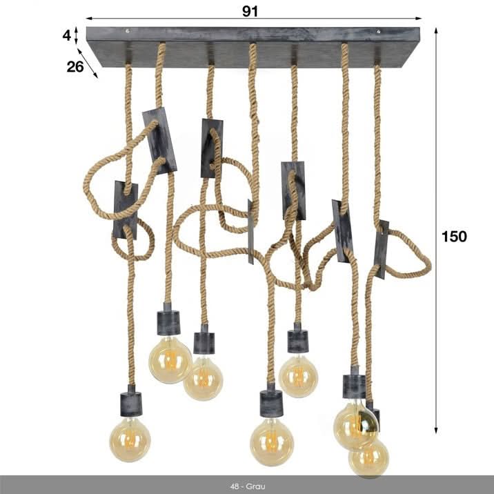 Diese authentische Hängelampe hat sieben Versionen. Die Armaturen hängen an Sackleinen, in die die Stromkabel eingewebt sind. Alle Seile sind individuell höhenverstellbar bis zu 150 cm. Dies sorgt für einen spielerischen Effekt. Diese Lampe markiert die Lichtquellen und der Raum ist wunderschön beleuchtet. Es wird empfohlen, eine LED-Lichtquelle (8467) zu verwenden.