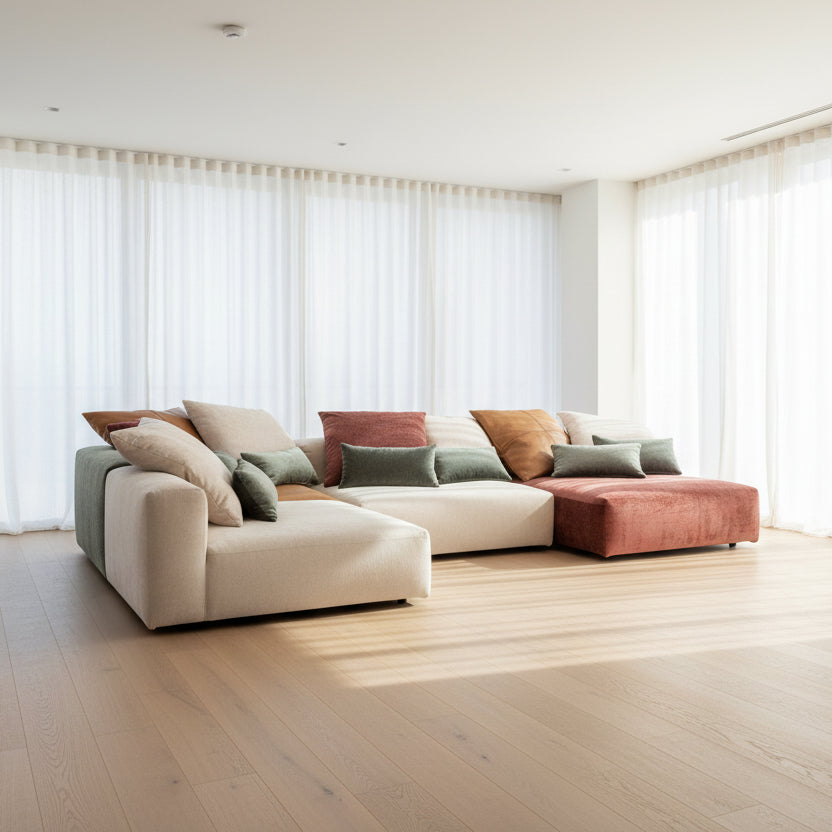 Die Jasmin ist perfekt für offene Wohnbereiche und frei im Raum platzierbar – ein echtes Statement-Sofa mit Lounge-Charakter. Der Sitz ist mega gemütlich und angenehm weich, ideal zum Entspannen und Versinken. Durch den hochwertigen Holzrahmen mit stabilem Schichtaufbau und den langlebigen Premium-Kaltschaum ist es auch ideal für den Objektbereich geeignet. Dank des modularen Systems kann Jasmin jederzeit erweitert, umgestellt und auf Wunsch auch im Sondermaß gefertigt werden.