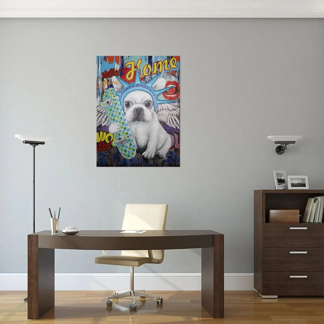 Das Wandkunstwerk „Liberty Dog“ auf Leinwand ist ein wunderschönes, 100 % handgemaltes Design voller Farbe und Flair. Cyanfarbenes LED-Neon wird auf die bemalte Leinwand gelegt, um den perfekten Neon-Pop zu erzeugen und den WOW-Faktor in Ihre Innenräume zu bringen.