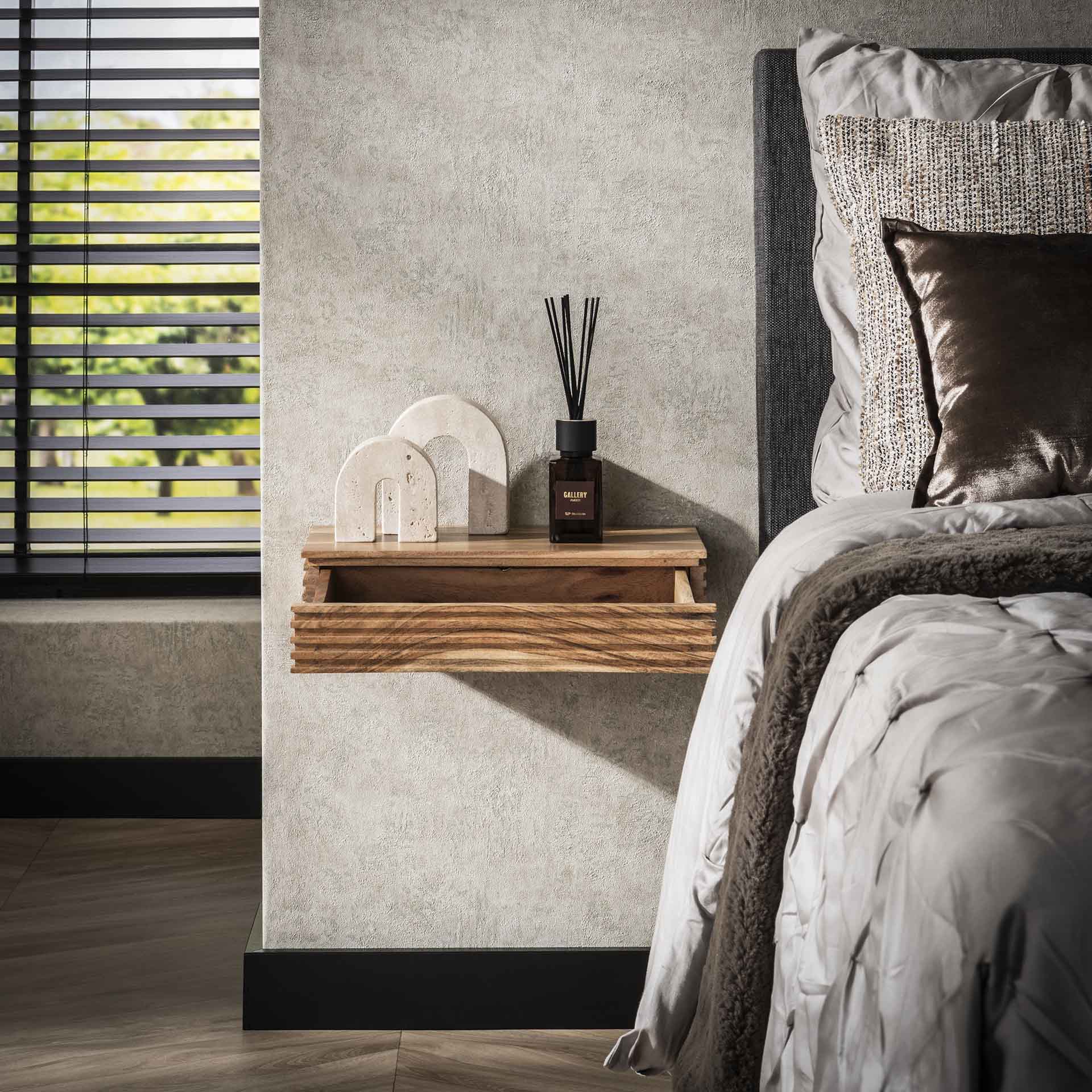 Dieser Nachttisch 'Layer L' besteht aus einem Set von zwei Teilen. Das Set ist aus Akazienholz gefertigt und hat eine Schublade mit Wellenmuster. Der Nachttisch wird mit 2 Schrauben an der Wand befestigt. Dieses Set ist auch in einer kleineren Version erhältlich.
