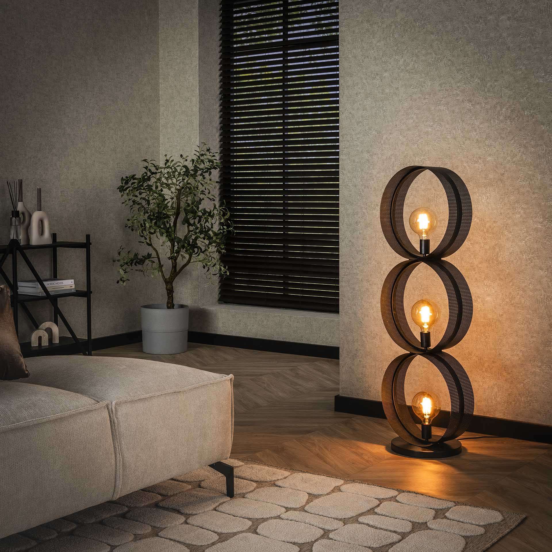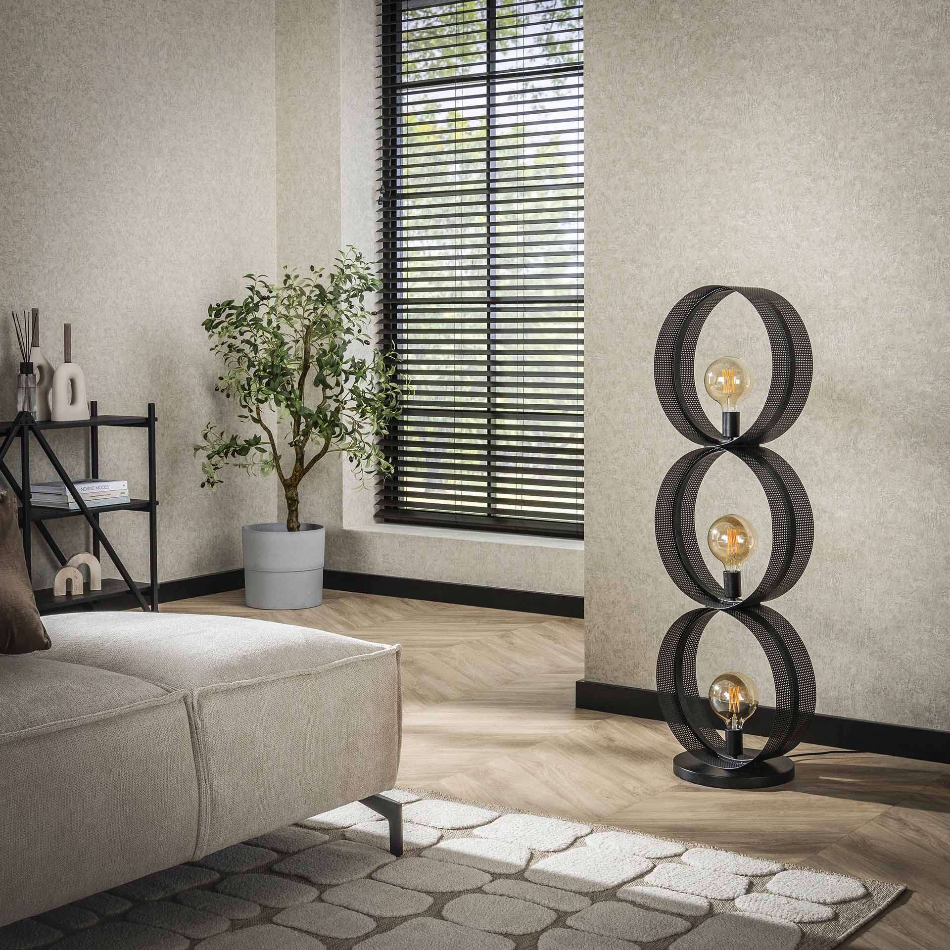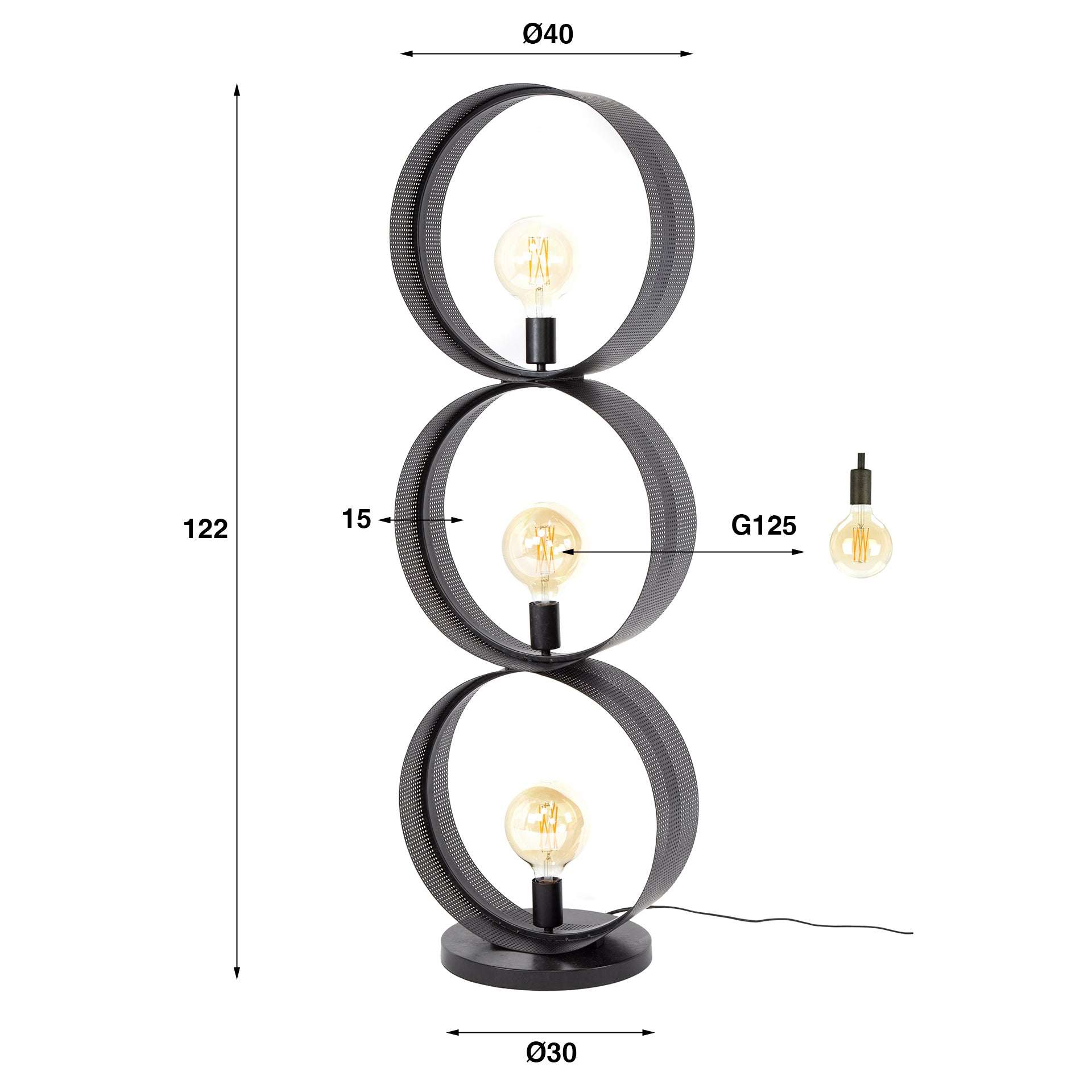 Diese Stehlampe ist aus Metall mit einer anthrazitfarbenen Oberfläche. Die drei Kreise sind auf einer runden Bodenplatte platziert, wodurch diese Lampe stabil ist. Die offene Form und die perforierten Schirme heben die Lichtquellen hervor. Es wird empfohlen, LED-Leuchtmittel (8467) zu verwenden. Diese Stehlampe ist auch in einer größeren Version erhältlich und hat eine passende Tisch- und Hängelampe.