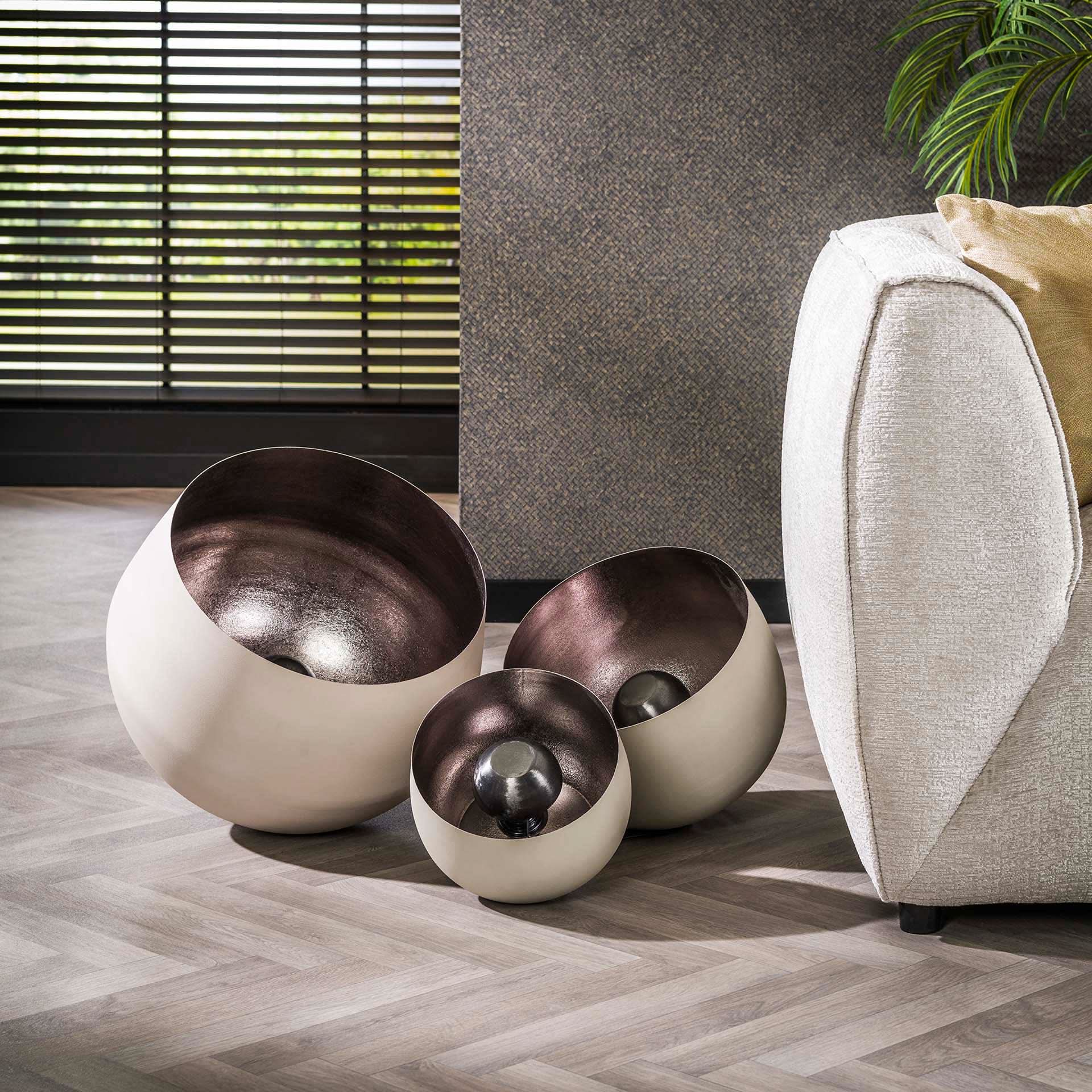 Diese Tischlampe ist in Naturgrau gehalten, was sie zu einer trendigen Lampe macht. Im Inneren wurde ein Reflektorschirm verwendet, der dem Licht eine schöne und verbesserte Ausstrahlung verleiht. Dieser Reflektorschirm kann nach Belieben verwendet werden und ist daher leicht zu entfernen. Die Leuchte hat keine Beine, so dass sie auf der Seite liegt. Wenn der Reflektorschirm verwendet wird, wird ein LED-Leuchtmittel (8465) empfohlen und wenn er nicht verwendet wird, wird ein LED-Leuchtmittel (8467) empfohlen. Diese Lampe gibt es auch in 2 kleineren und 1 größeren Version. Die Lampen sind sehr schön miteinander zu kombinieren, zum Beispiel neben dem Sofa oder in der Ecke eines Raumes.